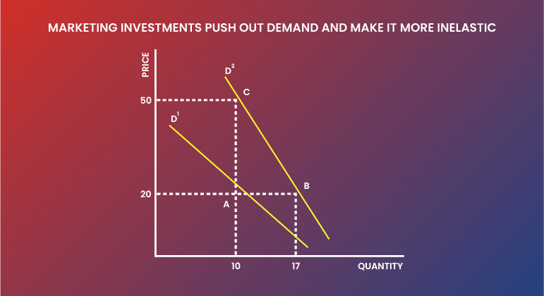 Going back to the IBM example, workers weren’t exempt from being fired because IBM was the right choice each time, but because it was the standard choice. Having an established brand supposes more intrinsic value than reality. This results in two benefits. First, a disproportionate, although delayed, rate of return. Lead generation usually requires targeted effort, but as brand prominence builds with greater investment, more leads begin to roll in passively. Thus, drastically bringing down short-term costs and shortening the conventionally long B2B sales cycle. Second, as per textbook economics, a change in taste shifts the demand curve. With marketing investment improving customer preferences vis-à-vis the business, the same quantity can be sold at a higher price. And the brand even enjoys the benefits of a monopoly, such as being able to charge a premium. Hence, the volume of passive leads and the premium charged can be used as additional measures for measuring marketing performance.