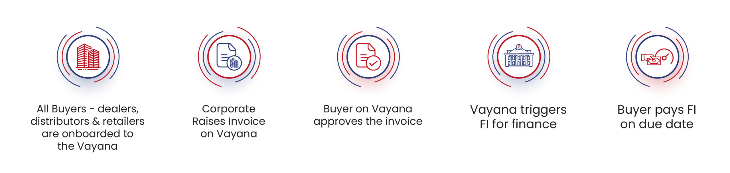 At Vayana we manage an end-to-end Account Receivable Financing program for all your customers or buyers. Our tailor-made & efficient solutions make receivable financing programs completely digital & hassle-free for corporates. Invoices are raised by corporates on the buyers and get funded post-acceptance by the respective buyer with funds credited to your corporate account.